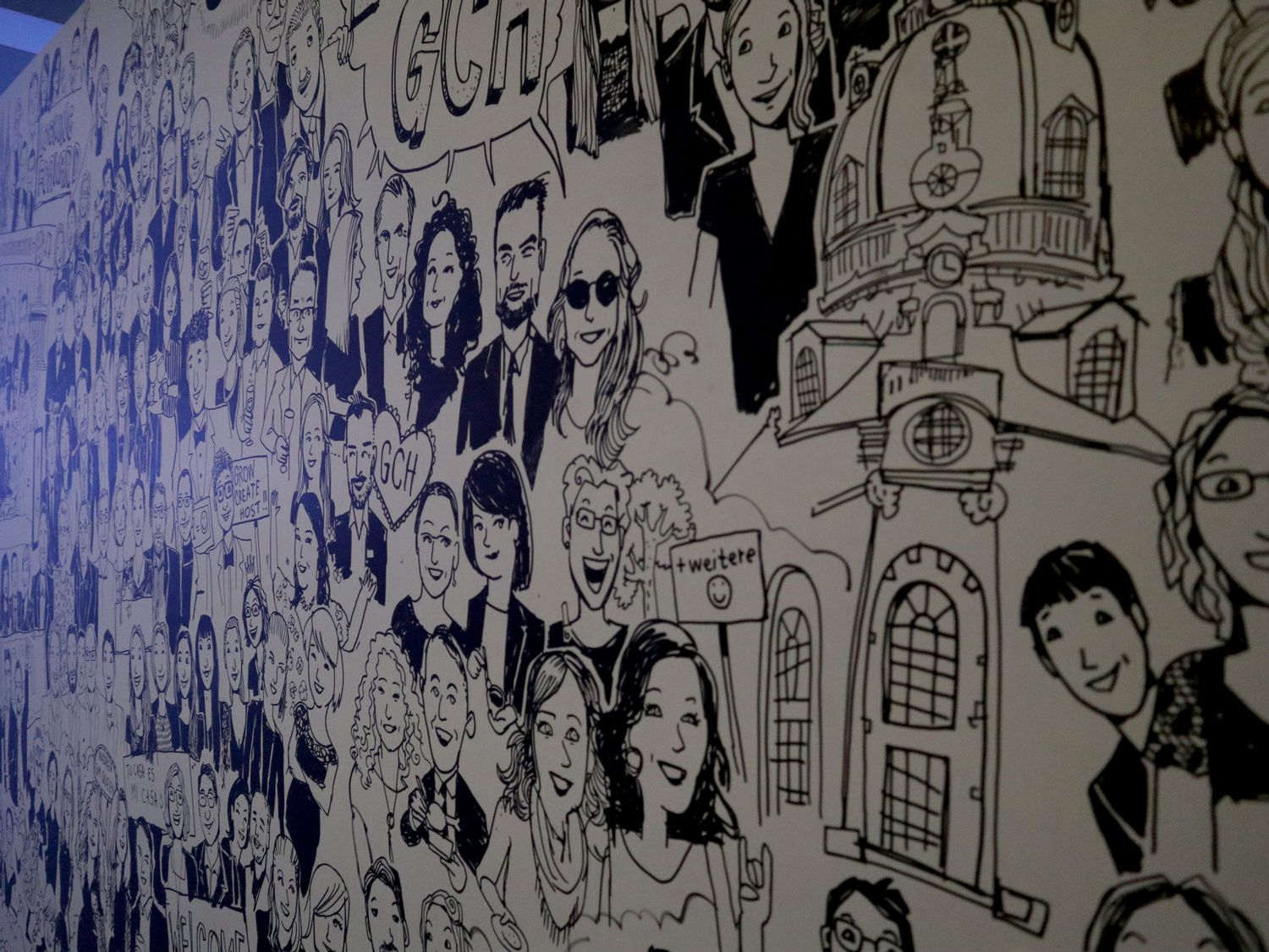 Every event is unique and has it’s own special needs. These pictures show work reaching from small scale watercolors over big scale walls to digital iPad paintings.